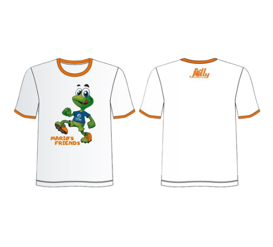T-shirt bianco in cotone con stampa colorata “Mario’s Friends” sul fronte e logo Jolly sul retro.