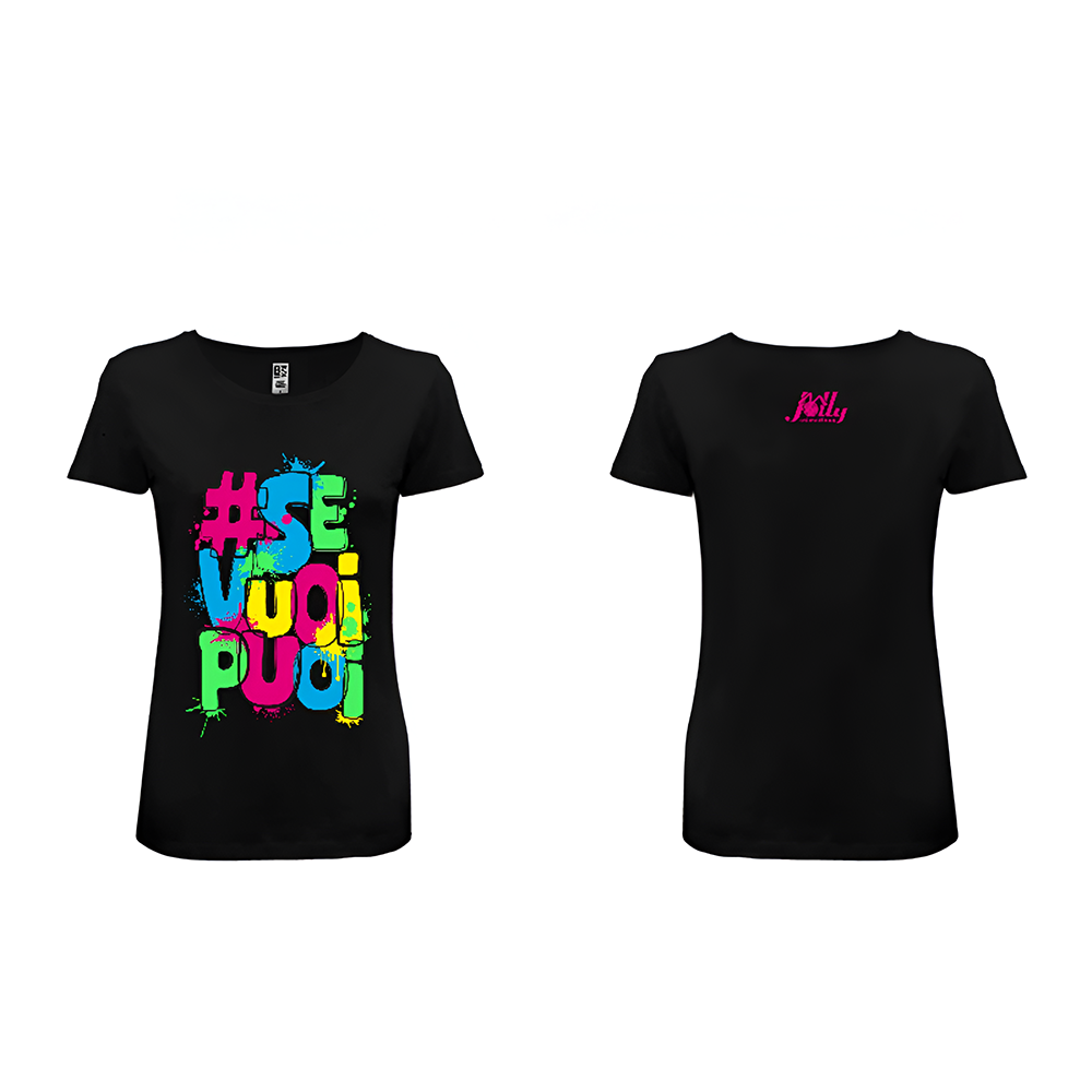 T-shirt nera in cotone con stampa colorata “#SeVuoiPuoi” sul fronte e logo Jolly sul retro.