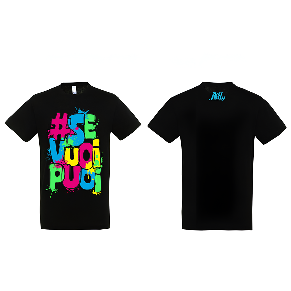 T-shirt nera in cotone con stampa colorata “#SeVuoiPuoi” sul fronte e logo Jolly sul retro.