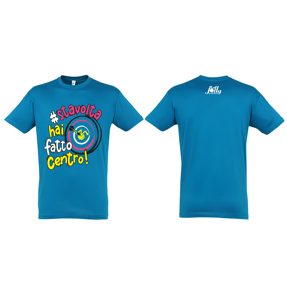 T-shirt azzurra in cotone con stampa colorata “#StavoltaHaiFattoCentro” sul fronte e logo Jolly sul retro.